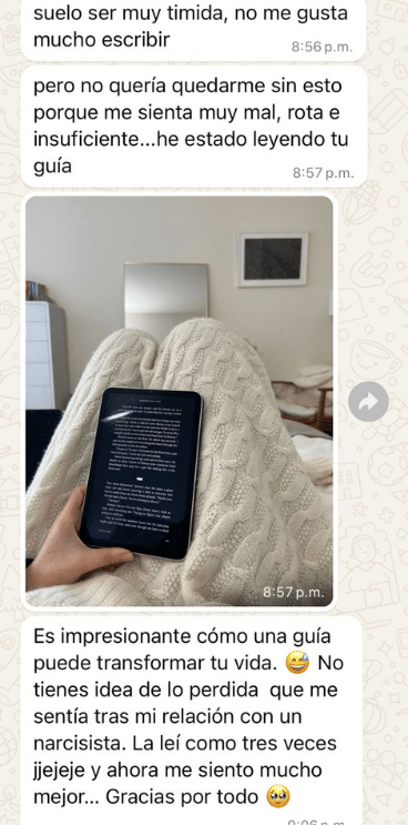 Hoy tengo una pareja que me ama, vivo una relación sana y me amo a mí misma más que nunca. Por eso quiero compartir esas herramientas contigo, porque no tienes que hacerlo sola: “VUELVE A SER TÚ” es el primer paso para romper el ciclo y recuperar tu vida. Estaré contigo en este camino, y si yo pude salir, tú también puedes.